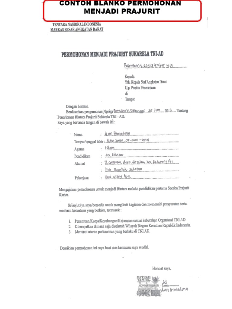 Contoh Surat Lamaran Menjadi Prajurit Bintara Tni Ad ... from 4.bp.blogspot.com Sebagai surat lamaran, salam penutup menjadi sangat penting. Untuk tambahan data yang diminta oleh perusahaan, maka saya lampirkan beberapa persyaratan yang dapat menjadi pertimbangan bapak/ibu. Karena tni ad telah membuka pendaftaran taruna akmil tni. Tni anggap tes keperawanan relevan bbc news indonesia. Sebaliknya, mencari pekerjaan sangat sulit di indonesia, sekalipun untuk orang orang yang sudah tamat kuliah. Akademi militer center of excellence. Berikut ini contoh surat lamaran kerja yang baik dan benar serta menarik perhatian yang dapat anda gunakan dalam tema maupun format penulisan surat. Apapun yang menjadi daya saing pelamar, upayakan ditulis.